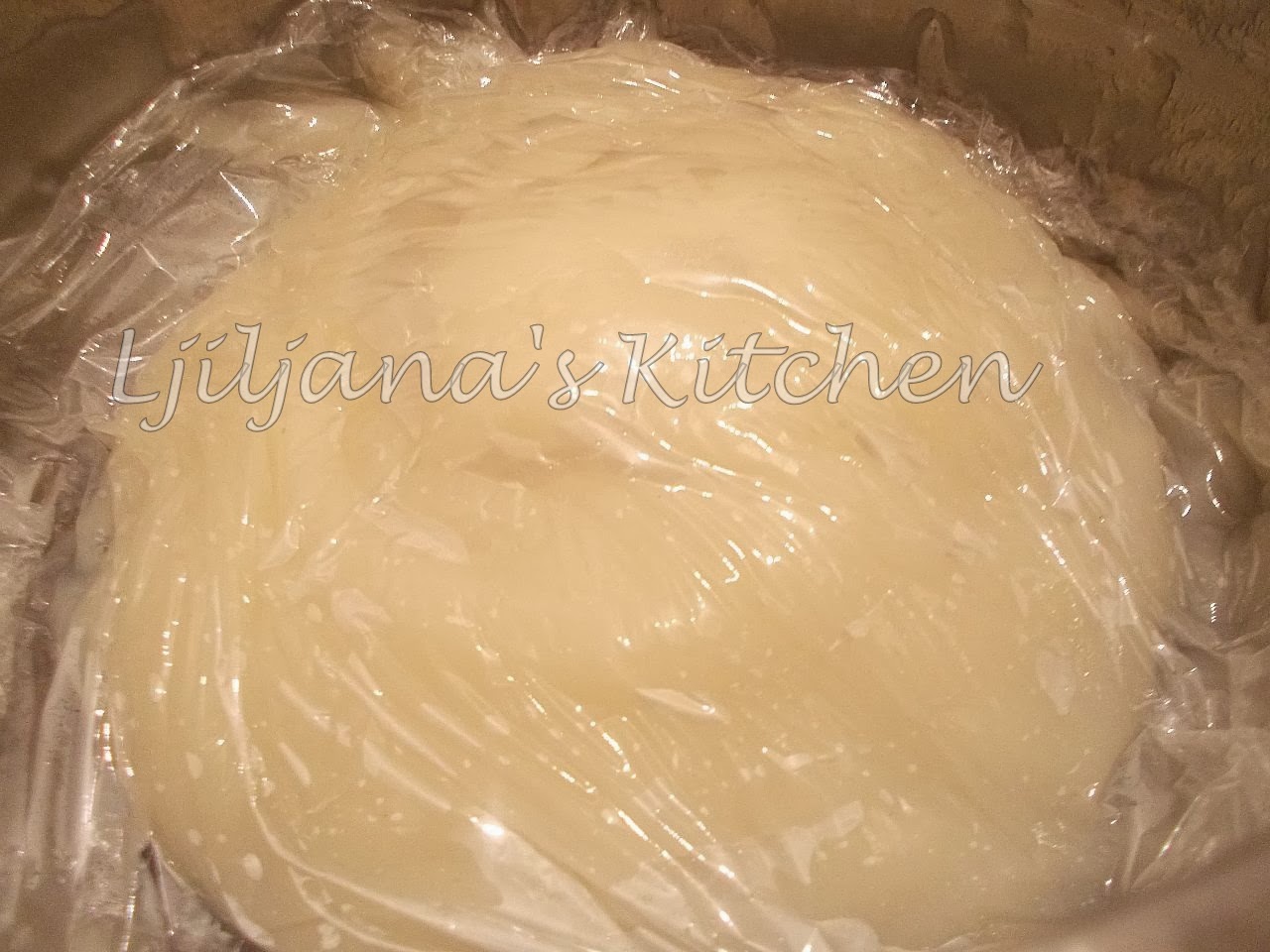 Ostatak vode zakuhati, pa kad provrije, dodati smjesu sa brašnom i žicom neprestano miješati da se dobije smjesa nalik pudingu.